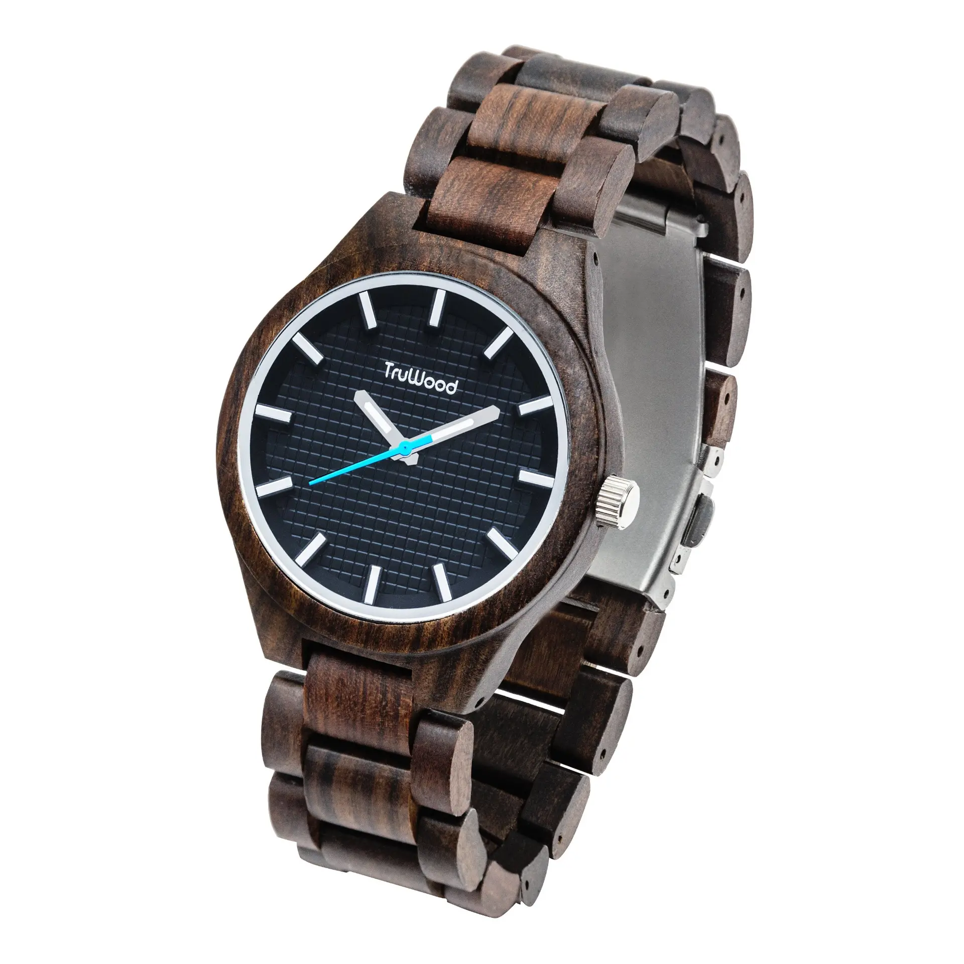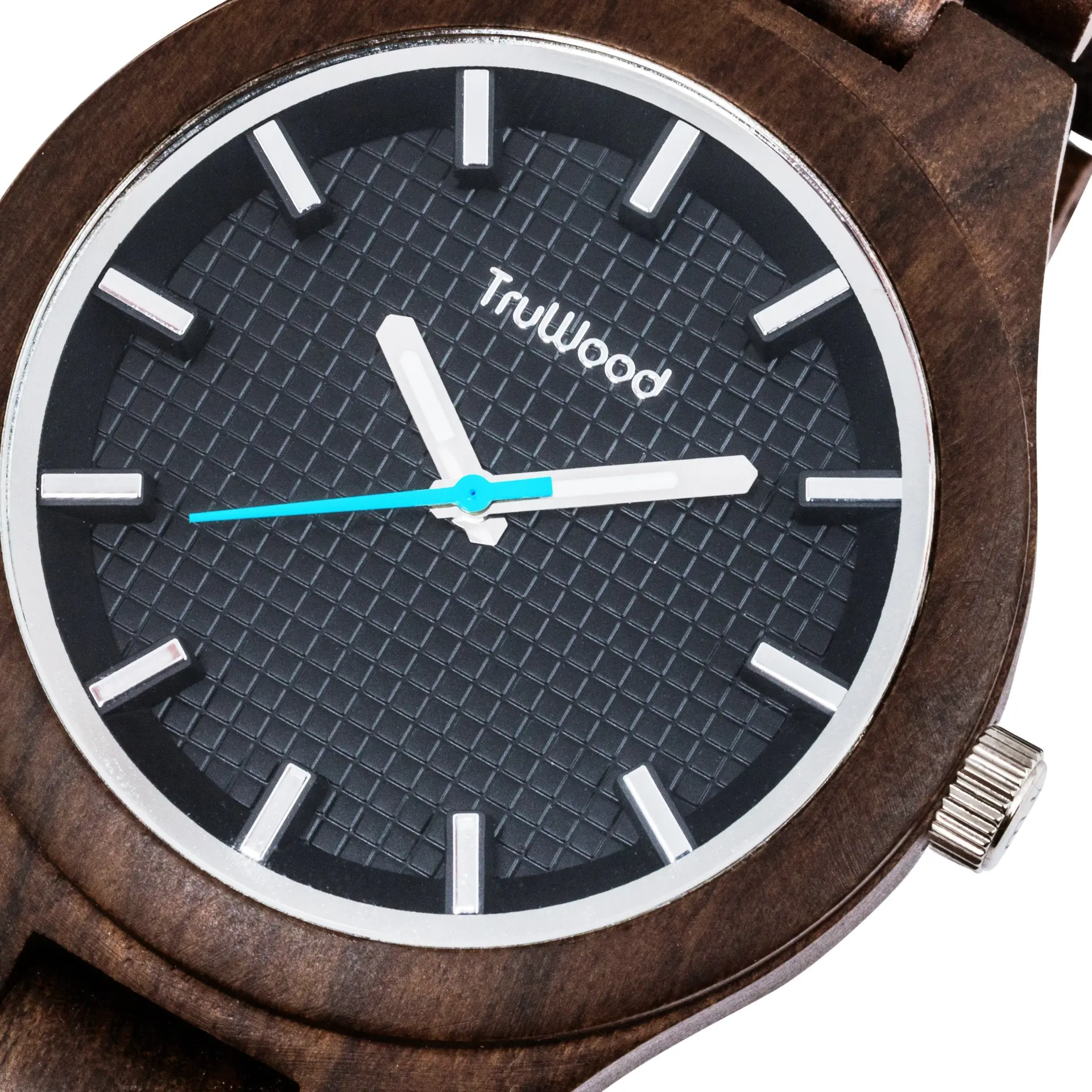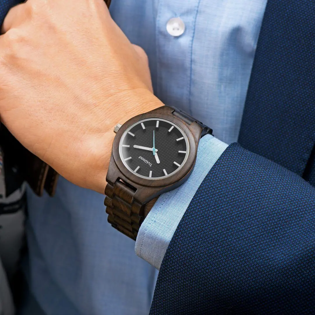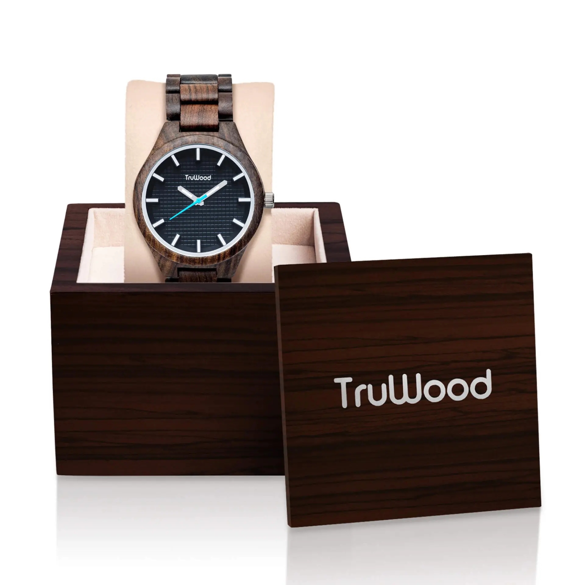 Everyday elegance has never been so accurate a description for any timepiece. The TruWood Capitan is handcrafted by expert watchmakers, built on excellence and never cutting corners. The black sandalwood case is polished to ensure a uniform grain and specially cured for water resistance in a stunning slim profile. A black square pattern dial housed in a sapphire coated crystal glass provides the perfect bridge between bold and simplicity. The lightweight dark wooden links complete the Capitan as your most comfortable watch ever.