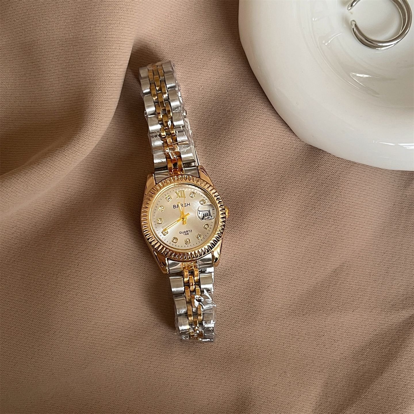 Color: Silver band with white dial, silver band with black dial, silver band with pink dial, two-tone gold and white dial, two-tone gold and gold dial, gold band with white dial, gold band with gold dial, rose gold with white dial, rose gold with pink dial