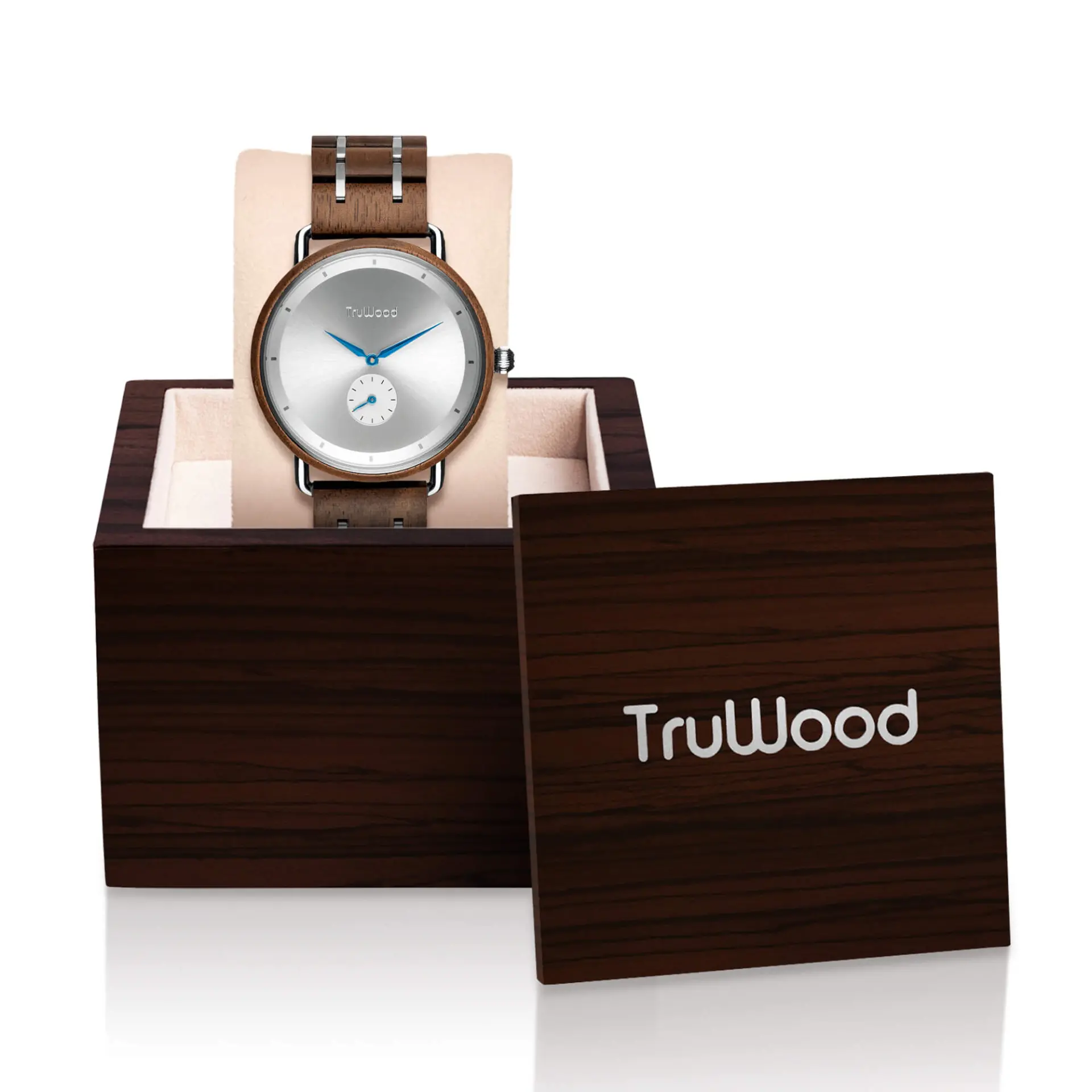 Minimal yet undeniably sophisticated, the TruWood Dune is the true Gentlemans watch choice. Thecolour pairings in the brown walnut wood and metal are specifically chosen to compliment each other and stand out as a match made in heaven. Featuring a clean silver dial with metallic blue accent hands, theDune uses a combination of plated silver stainless steel lugs and brown wood band links to create a timepiece that will stand the test of time. With its perfectly aligned inner sub dial, precision in modern craftsmanship has and will never look as distinguished as this.