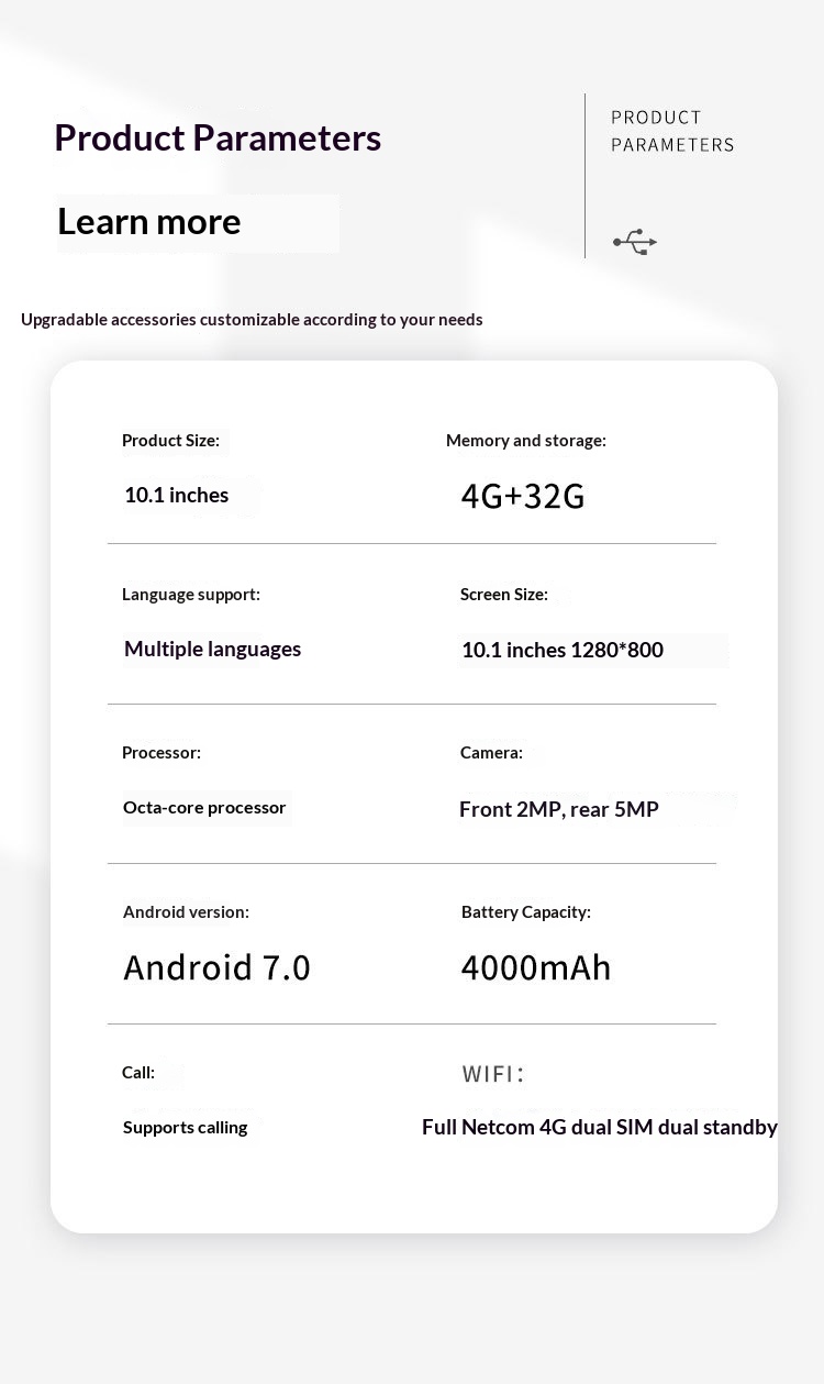 Additional Features: Supports Bluetooth, GPS navigation, gravity sensor, compass, ARM architecture, IPS display, and more.