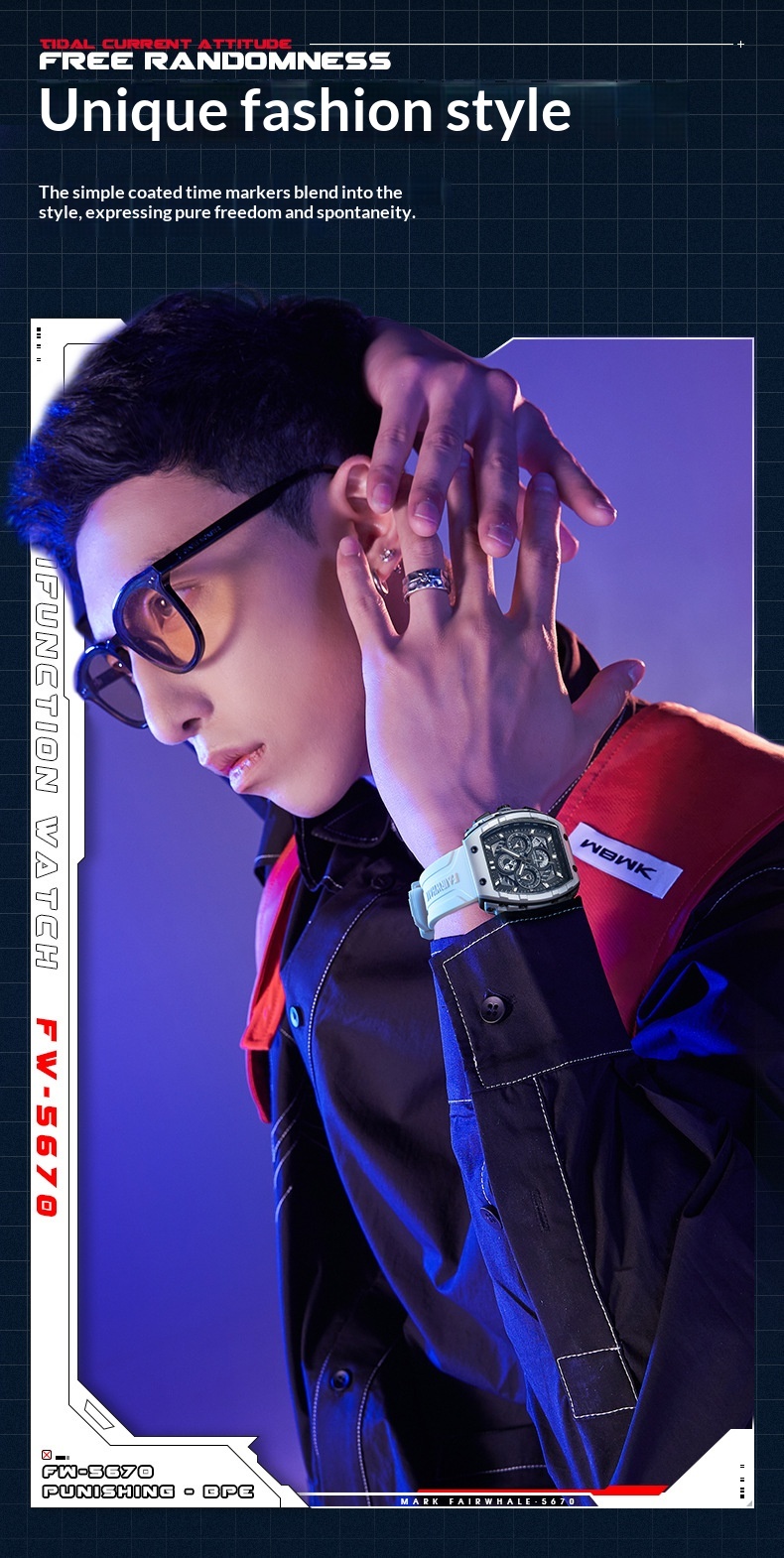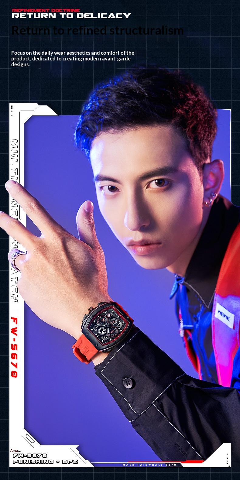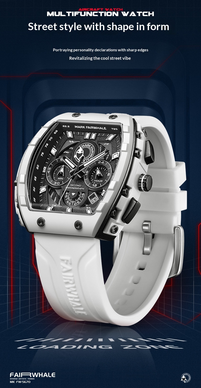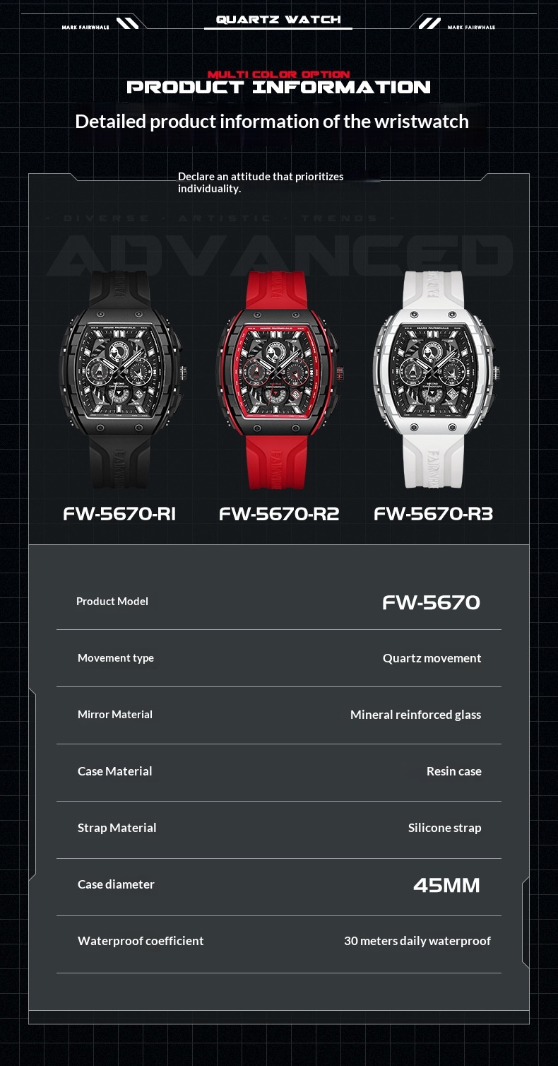Color: FW-5670-R1 — Black case, black dial, black strap; FW-5670-R2 — Black case, red dial, black-and-red striped strap; FW-5670-R3 — White case, black dial, black strap
