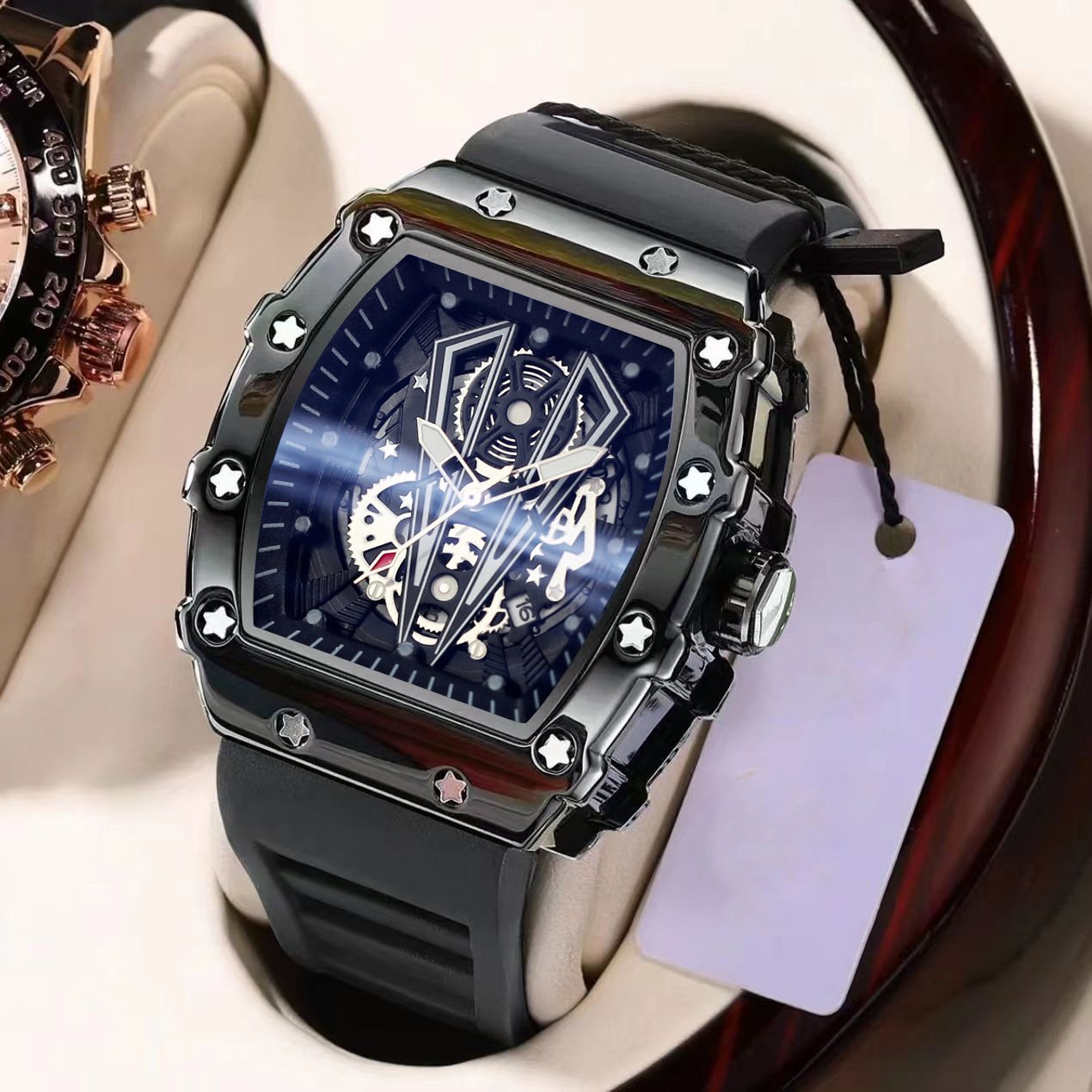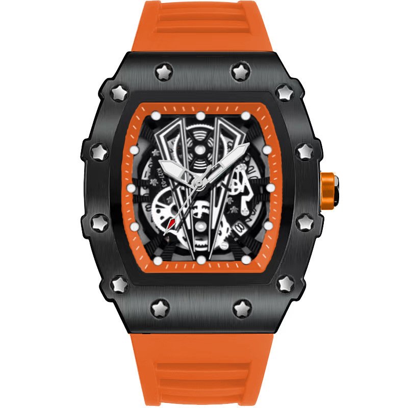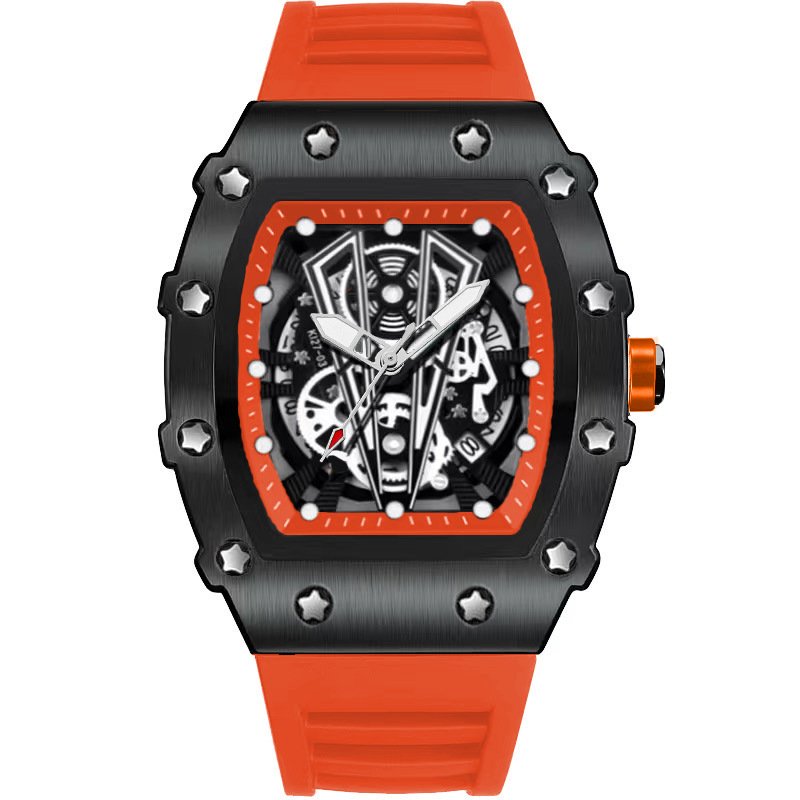 Colors: Black, red, yellow, blue, orange; gold case with black strap, gold case with red strap, gold case with yellow strap, gold case with blue strap, gold case with orange strap; silver case with black strap, silver case with red strap, silver case with yellow strap, silver case with blue strap, silver case with orange strap.