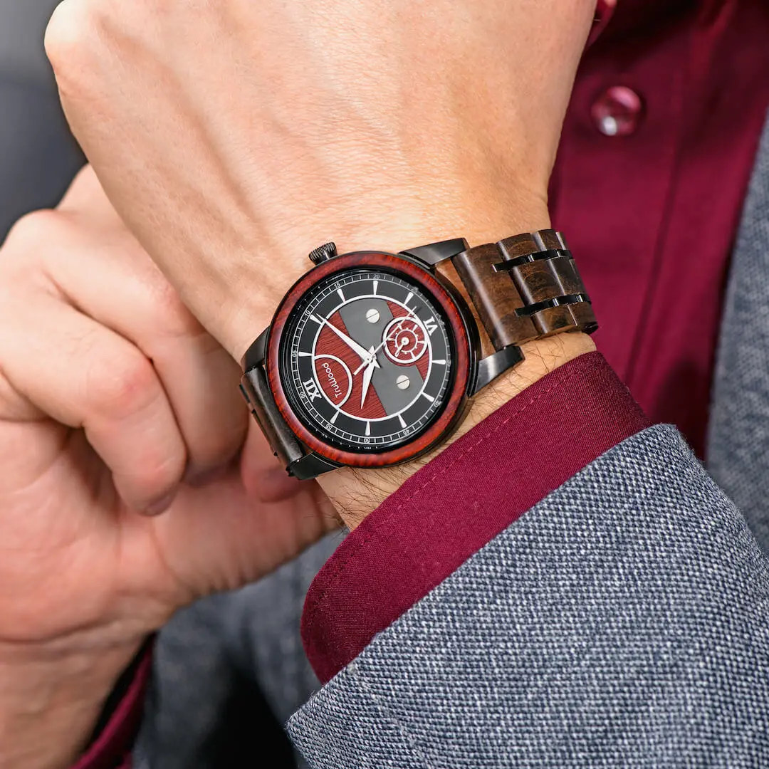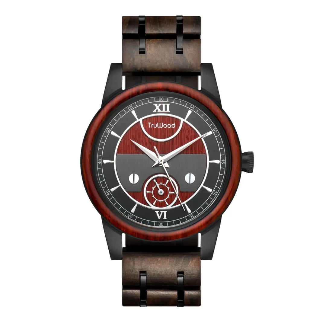 The TruWood Napoleon watch is a paradigm shift. Inspired by the human drive to explore in mind, this collection serves as a reminder to discover and achieve the unattainable. Each Napoleon timepiece is crafted with hand-picked black and red sandalwood, masterfully designed after the ships that have traversed our oceans. The polished wooden link band is held together by black stainless steel lugs and clasp, topped with a redwood bezel reminiscent of history’s greatest explorers. This watch rests lightly on your wrist, sporting a subtle sub dial so you can look your best when delving into uncharted territory.