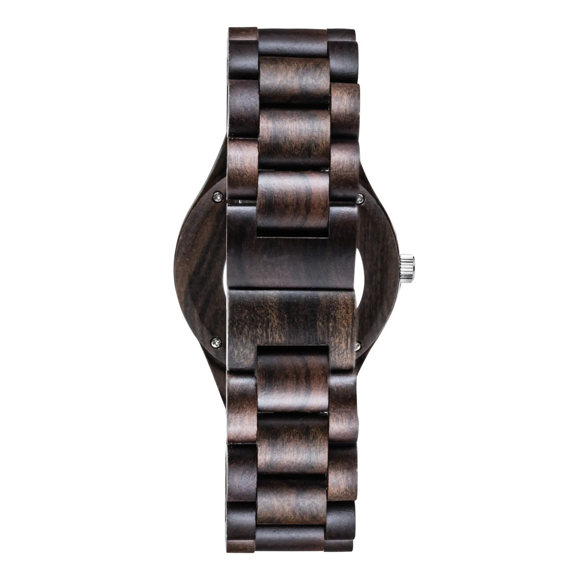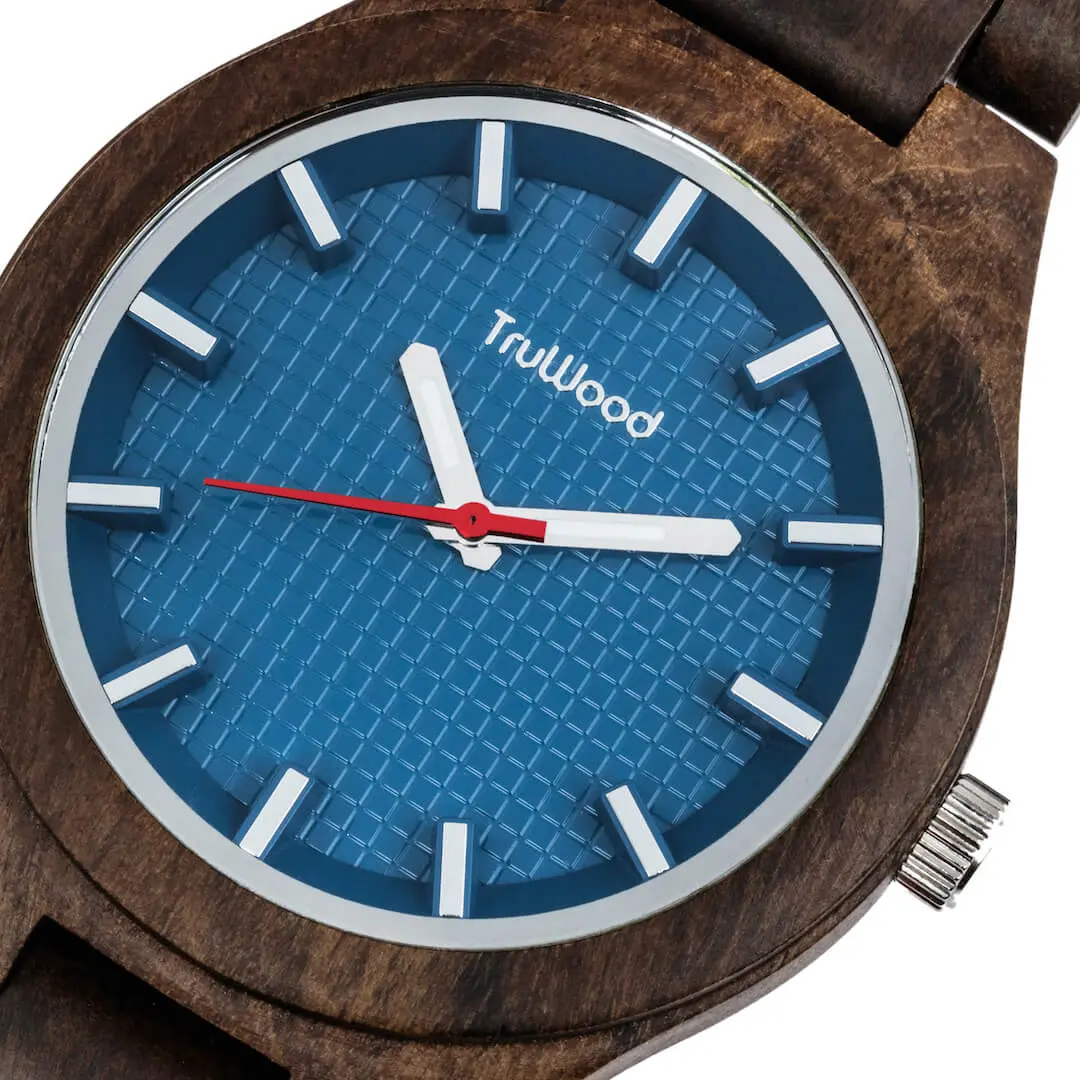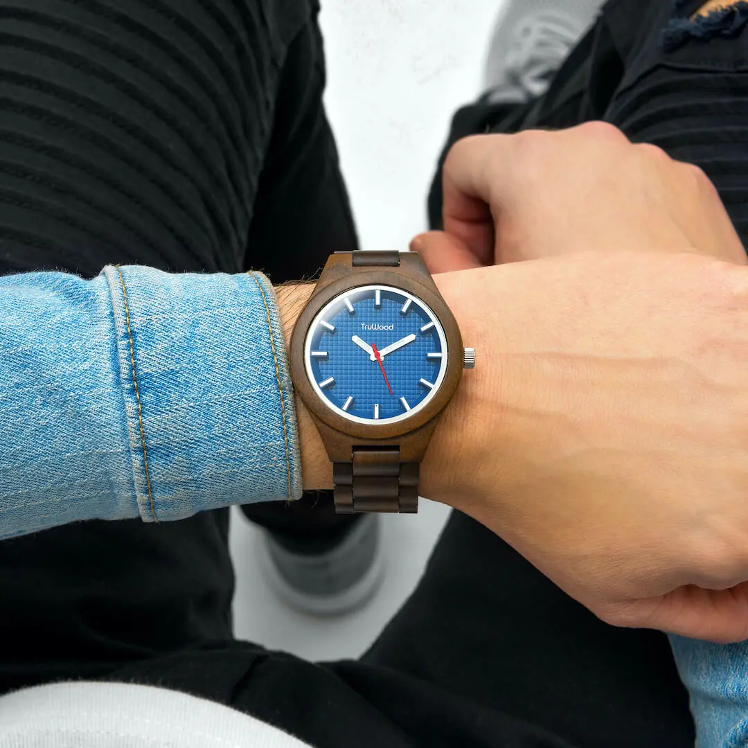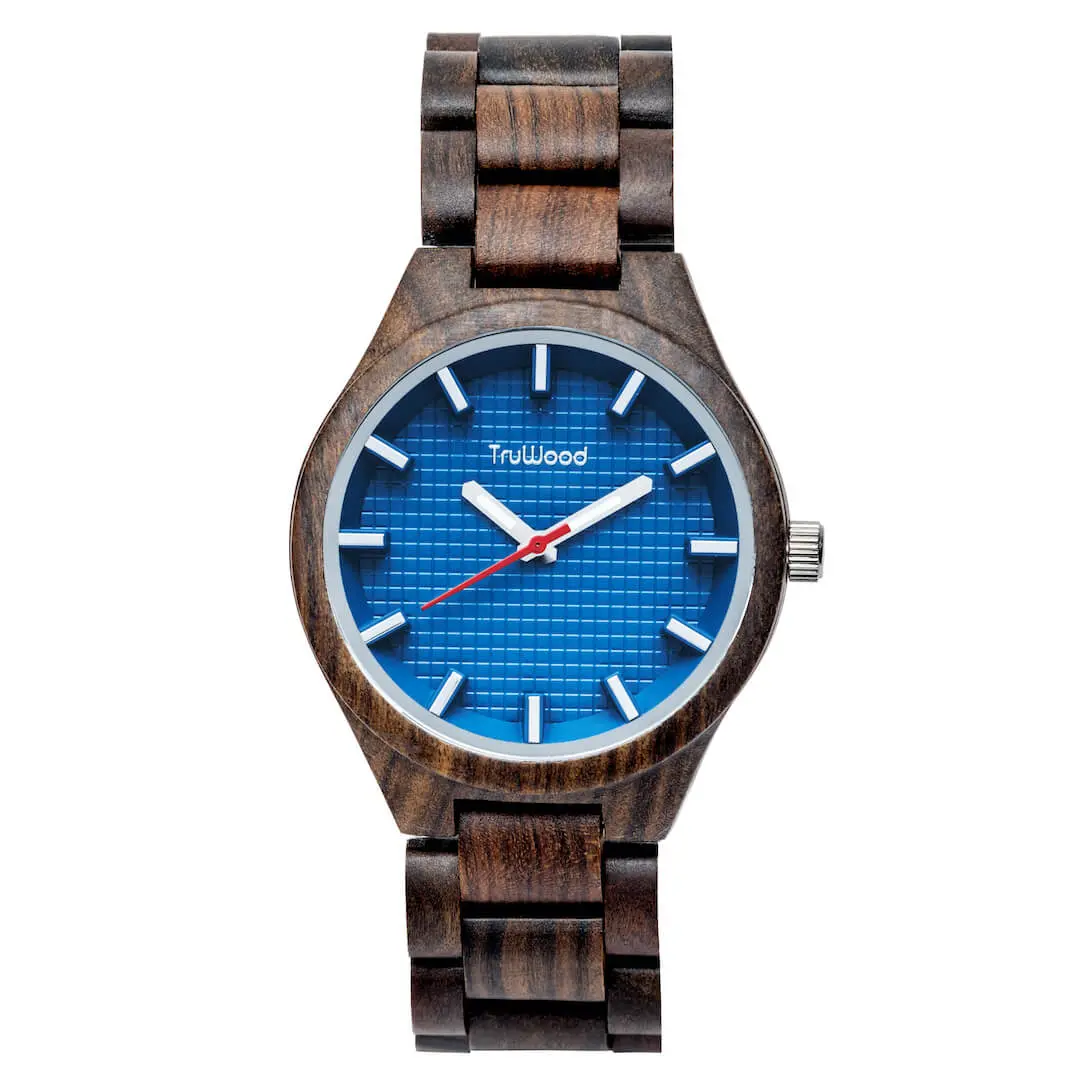 Everyday elegance has never been so accurate a description for any timepiece. The TruWood Navigator is handcrafted by expert watchmakers, built on excellence and never cutting corners. The black sandalwood case is polished to ensure a uniform grain and specially cured for water resistance in a stunning slim profile. A blue square pattern dial housed in a sapphire coated crystal glass provides the perfect bridge between bold and simplicity. The lightweight dark wooden links complete the Navigator as your most comfortable watch ever.